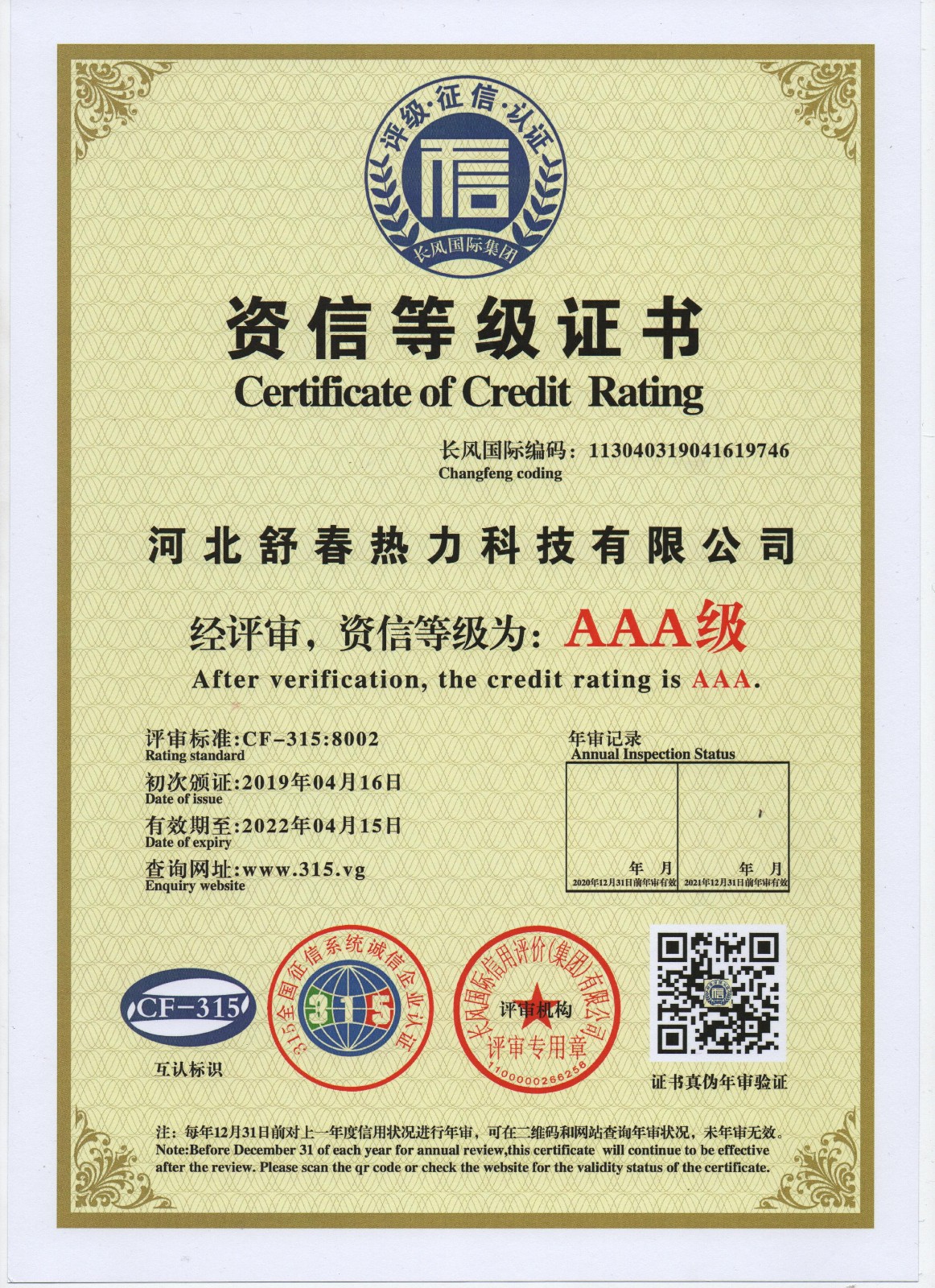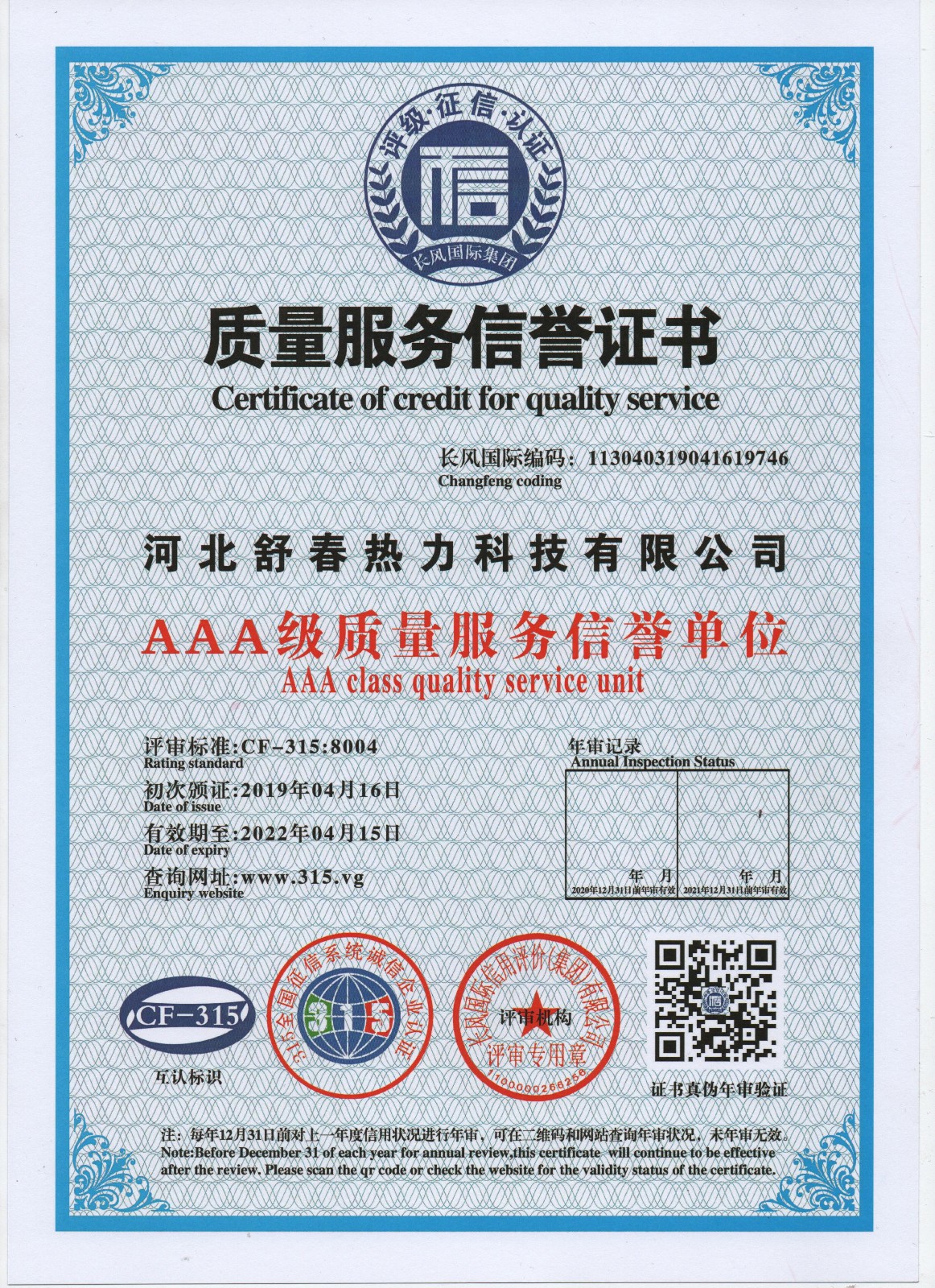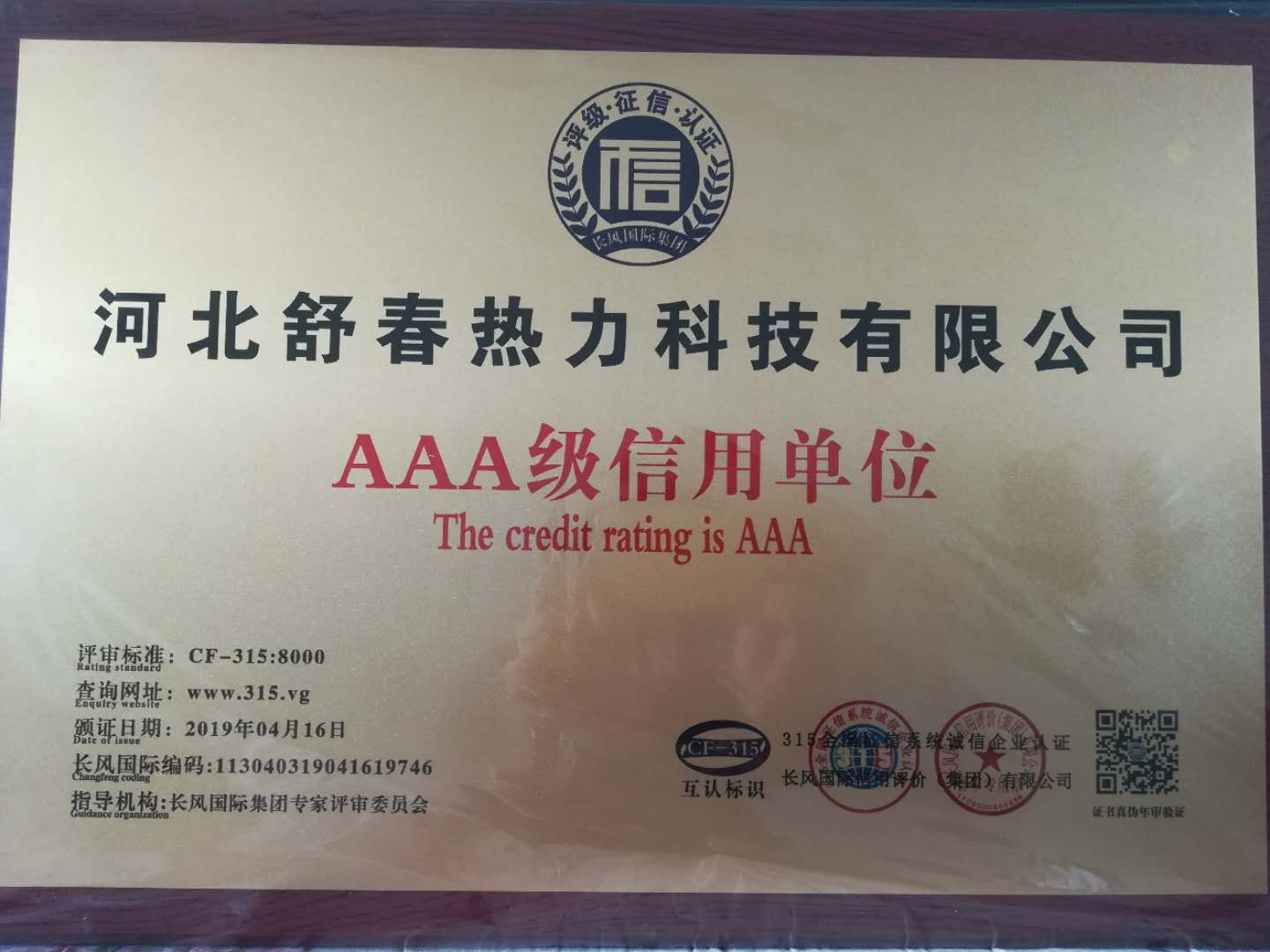 AAA級信用單位,舒春真誠對待每一個人 2019年4月16日,河北舒春熱力科技有限公司取得了AAA級信用單位、誠信經理人、誠信企業(yè)家、AAA級質量服務信譽單位、 AAA級重合同守信用單位、AAA級誠信經營示范單位、AAA級資信等級、AAA級信用等級。