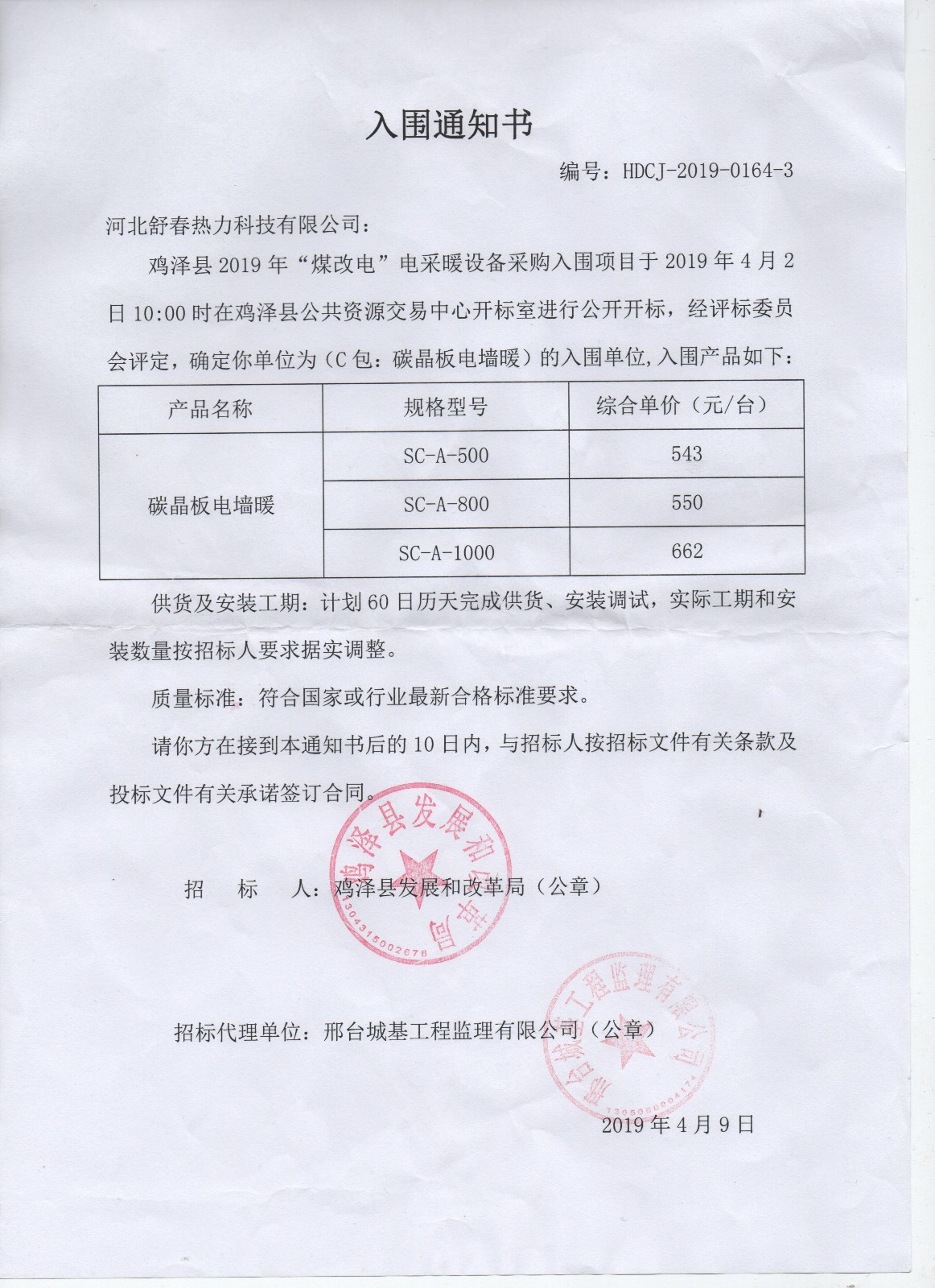 “煤改電”舒春在行動 2019年4月9日,河北舒春熱力科技有限公司收到了來自雞澤縣發展和改革局的雞澤縣2019年“煤改電”電采暖設備采購入圍 項目C包:碳晶板電墻暖入圍通知書。 并于2019年4月18日正式簽訂采購安裝合同。